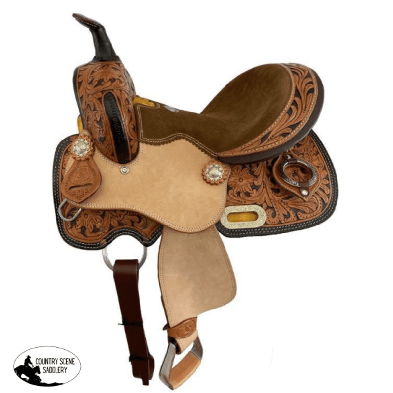 539512 12"Double TYouth barrel style saddle set with a two-tone floral tooling. This saddle features medium and dark oil two-tone floral weave tooled leather skirt, pommel and cantle. Has rough out fenders and jockeys with a light brown suede seat. Saddle