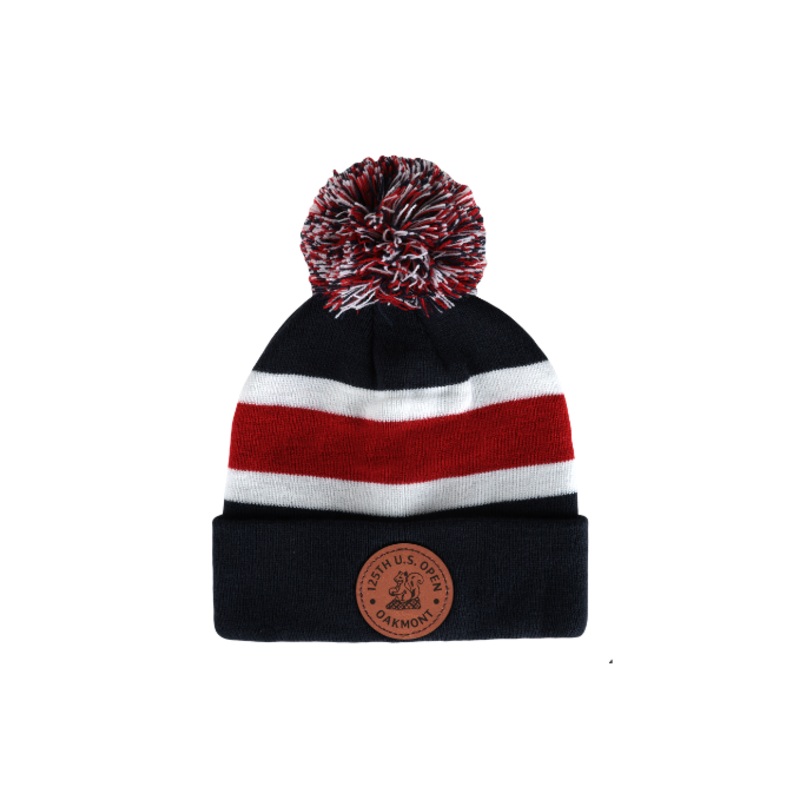 Stay warm and show your patriotic pride with this ultra-comfortable red, white, and blue knit hat, complete with a fun pom on top. A cozy tribute to a historic championship. Features a unique and stylish front Laser etched leather applique U.S. Open Logo.C