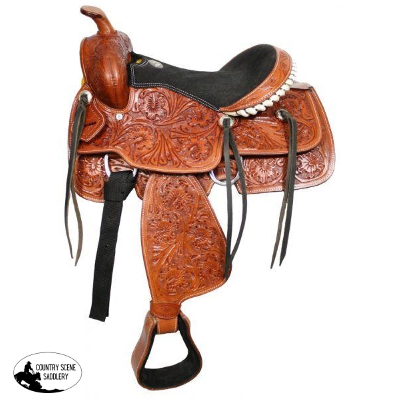 13″ Fully tooled Double Tyouth saddle withsuede leather seat.Saddle is double rigged and features a rawhide silver laced cantle.