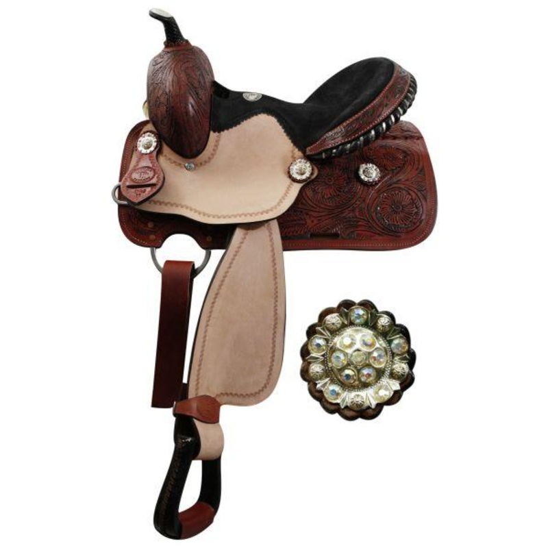 13″ YouthDouble Tbarrel saddle with fully tooled pommel, skirts and cantle. Saddle features crystal rhinestone conchos, roughout fenders and jockies, rawhide braided horn, and a black suede seat with a black rawhide cantle with silver inlay. Saddle features inskirt rigging and close contact skirts. Comes with a leather latigo tie strap and off billet.