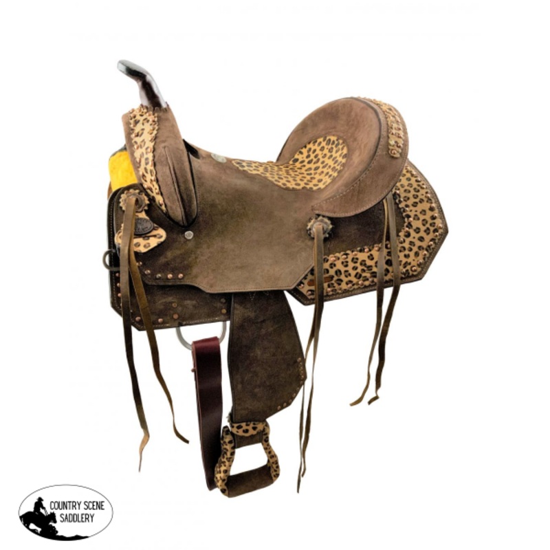 15860Double T Hard Seat Barrel style saddle with Cheetah Seat. This saddle is a rough out chocolate brown in color and features a cheetah print inlay in seat. Saddle is accented with hair on cheetah accents n the skirts, pommel, and stirrups. Features copp