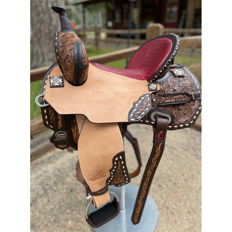 S-CYMJ60-202516741This is a slightly modified version of our NEW Gold Buckle Saddle. This saddle features a 3/4 Vintage flower tooling. We have added a red croc bicycle seat on this saddle which matches beautifully with the matching tooled overlays. Of cou