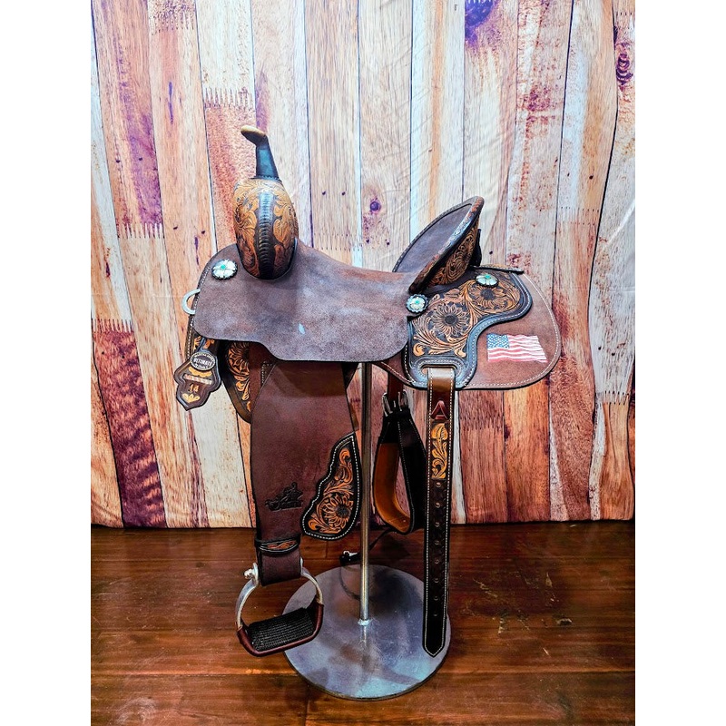 S-CYMJ57-202516208This is a slightly modified version of the new Josey Patriot Spirit. This saddle has been given dark chocolate roughout under the overlays to allow them to really pop! This saddle features a pencil roll cantle for that extra deep seat tha