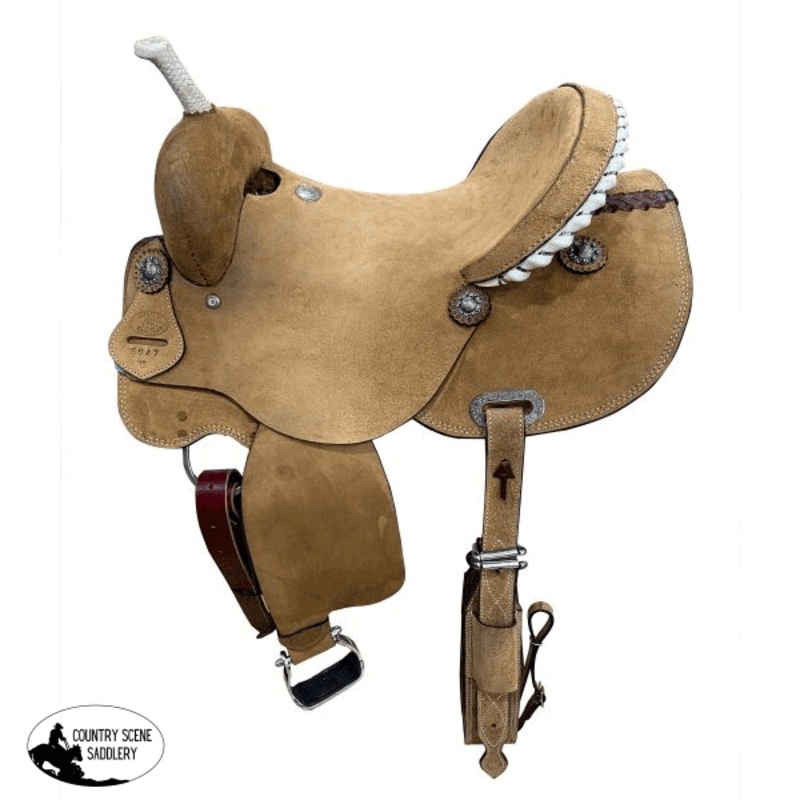 6947This saddle is completely light brown roughout with rawhide cantle trim and rawhide braided horn. Comes complete with back-rigging, latigo tie strap and off billet and aluminum stirrups. Seat: 15", 16"Gullet: 7"Bars:Full QHBarsSwell: 12Tree: Fiberglass
