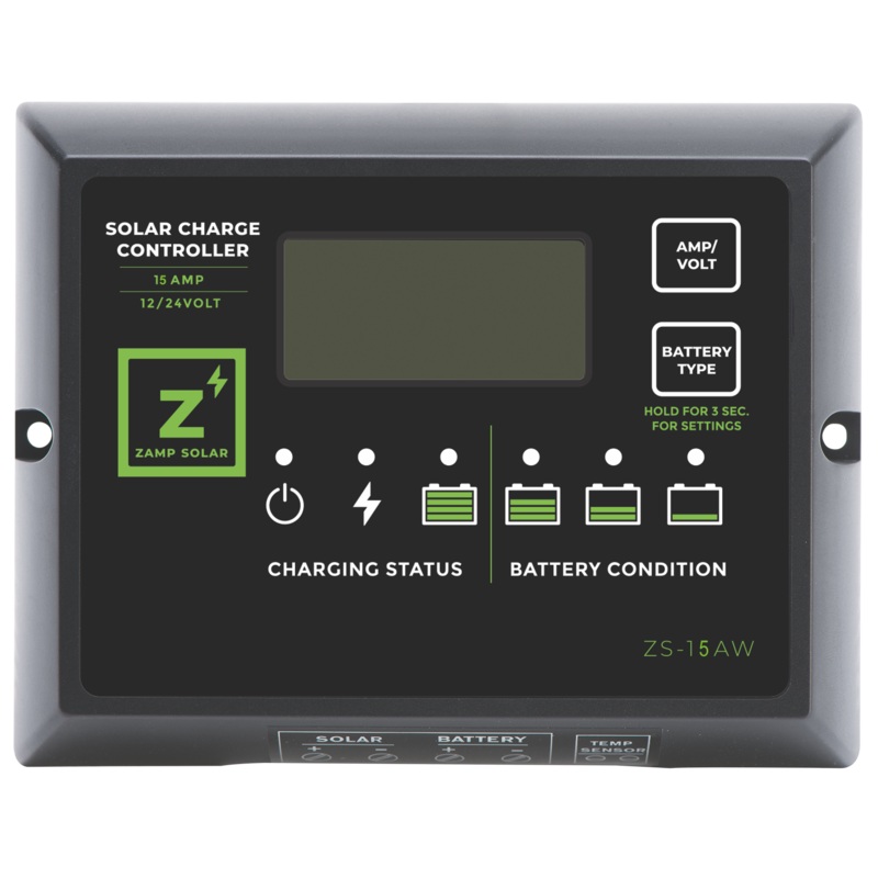 The Zamp Solar15-amp charge controller can regulate up to 250 watts and is compatiblewith Lithium, Gel, AGM, Conventional lead-acid (wet) batteries, and LTO 12-volt batteries.
