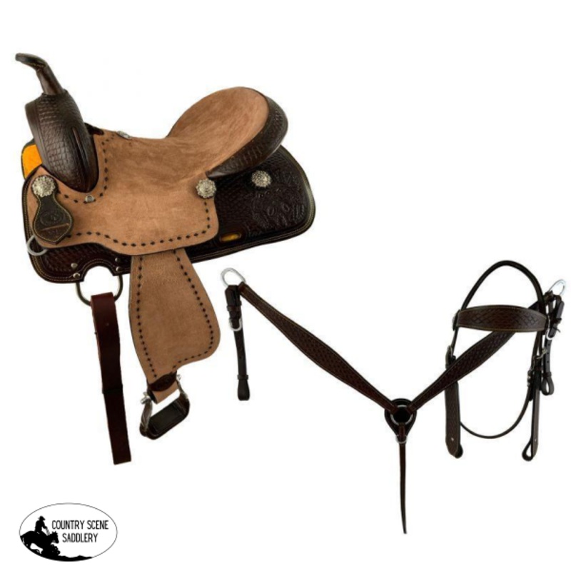 16″ Pleasure style saddle set comes with blue suede seat and a barbwire branding. This saddle is rough out in color and is accented with a blue stitched flower motif and black leather stirrups with a leather braided horn. Cantle features black leather with silver lacing. Saddle comes equipped with front D rings, leather latigo tie strap, off billets. Comes complete with a matching headstall w/ reins and a breast collar