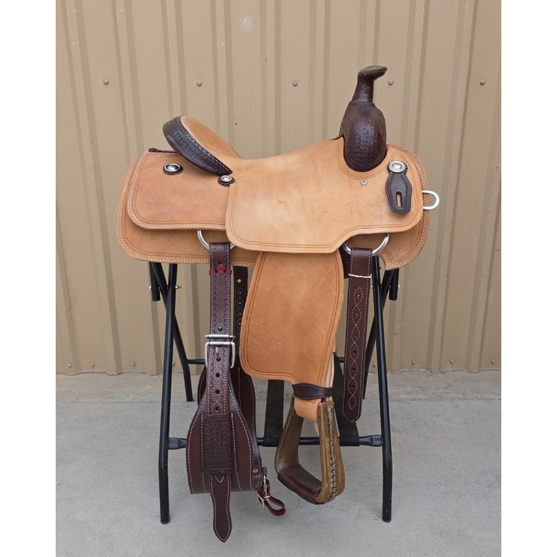 This saddle is built on a wooden rawhide covered tree and comes with a latigo, back flank, stirrups, back billits and offstrap. To order give us a call or email us. We take Visa, Mastercard and Discover. On any saddle, we can add your brand, custom lettering, upgraded conchos, upgraded stirrups, etc. Trophy lettering is available for $50 as well on any saddle.