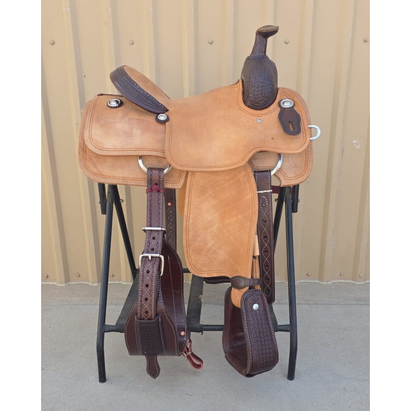This saddle is built on a wooden rawhide covered tree and comes with a latigo, back flank, stirrups, back billits and offstrap. To order give us a call or email us. We take Visa, Mastercard and Discover. On any saddle, we can add your brand, custom lettering, upgraded conchos, upgraded stirrups, etc. Trophy lettering is available for $50 as well on any saddle.