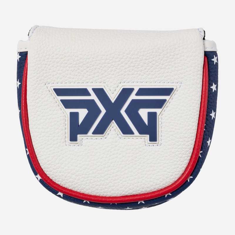 Protect your putter in style with our Stars & Stripes Mallet Headcover. It features a white polyurethane exterior shell and microfiber velour liner, with internal Quick-Stick cart magnet that attaches to the golf cart when not in use. Patterned in white st