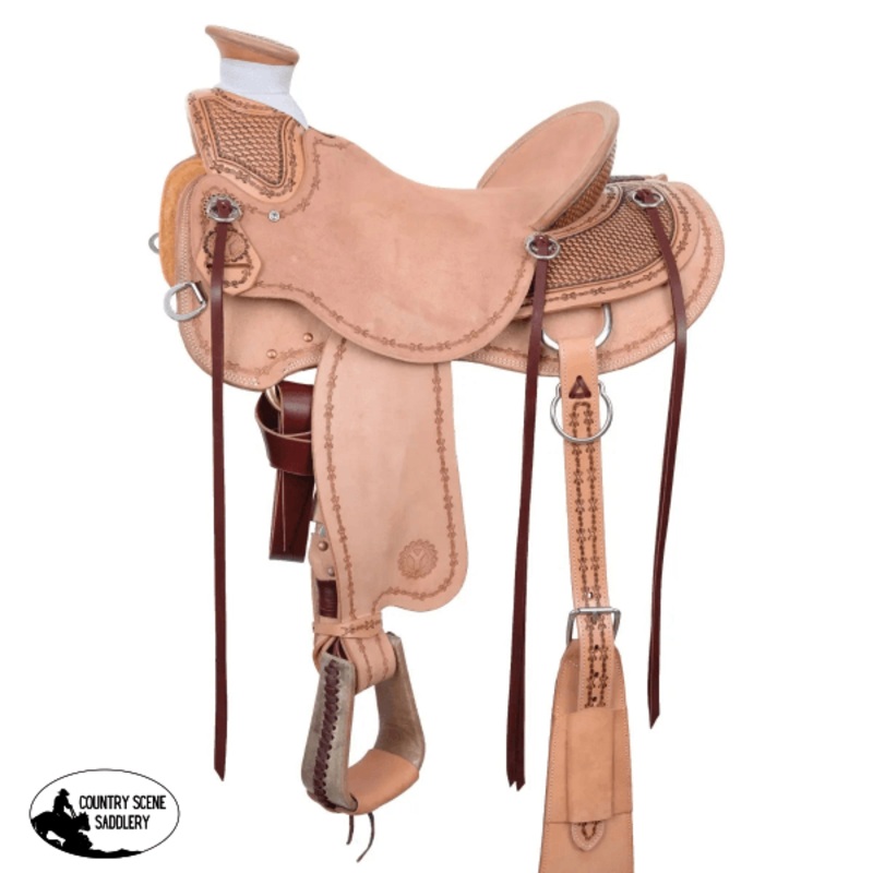 The 2119 Monterey Ranch Saddle is the perfect choice if you’re looking for a reliable, tough, and attractive saddle. This saddle is made with a Kevlar-reinforced tree that promises to withstand even the most rugged ranch work or day jobs. Its 1/4 antiqued mini basket weave tooling adds extra style and character, and the mulehide horn wrap provides added durability. Hamley twists on the stirrups will help riders stay comfortable all day, by helping to alleviate pressure on the knees and ankles. With six strings you’ll have plenty of places to attach appropriate accessories for those long days in the saddle. Upgrade your riding experience today with The Monterey Ranch Saddle!