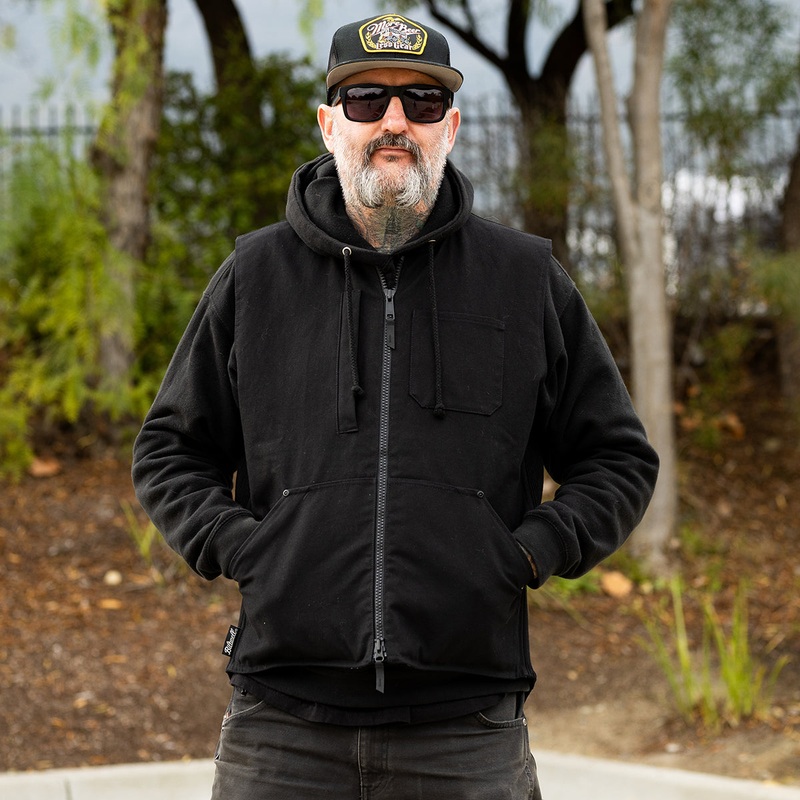 Otto (62, 185lb.) is wearing our Black 4-Speed vest in size Large over a Biltwell hoodie.