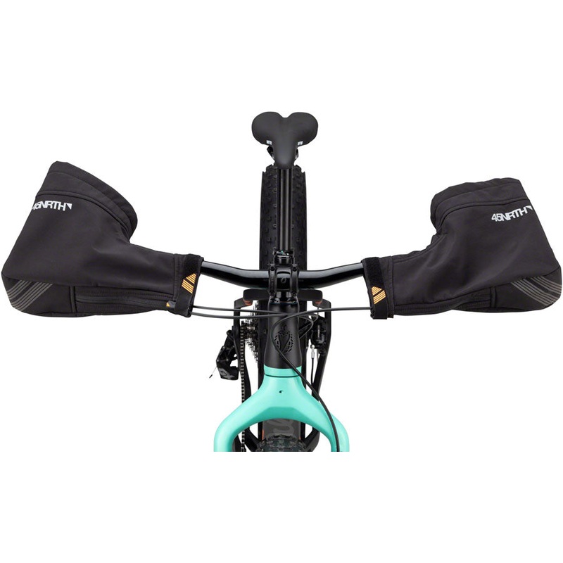 45NRTH Draugenklaw Pogies: Black One Size. When all you need is a shield to block wind there is Draugenklaw. The sleek and open design makes it easy to get your hands in and out for riding in single track or commuting. A zippered handlebar closure and bar-end mount make it simple to install and remove while still providing a secure fit. Reflective wrist cuff promotes visibility for commuting or city riding.