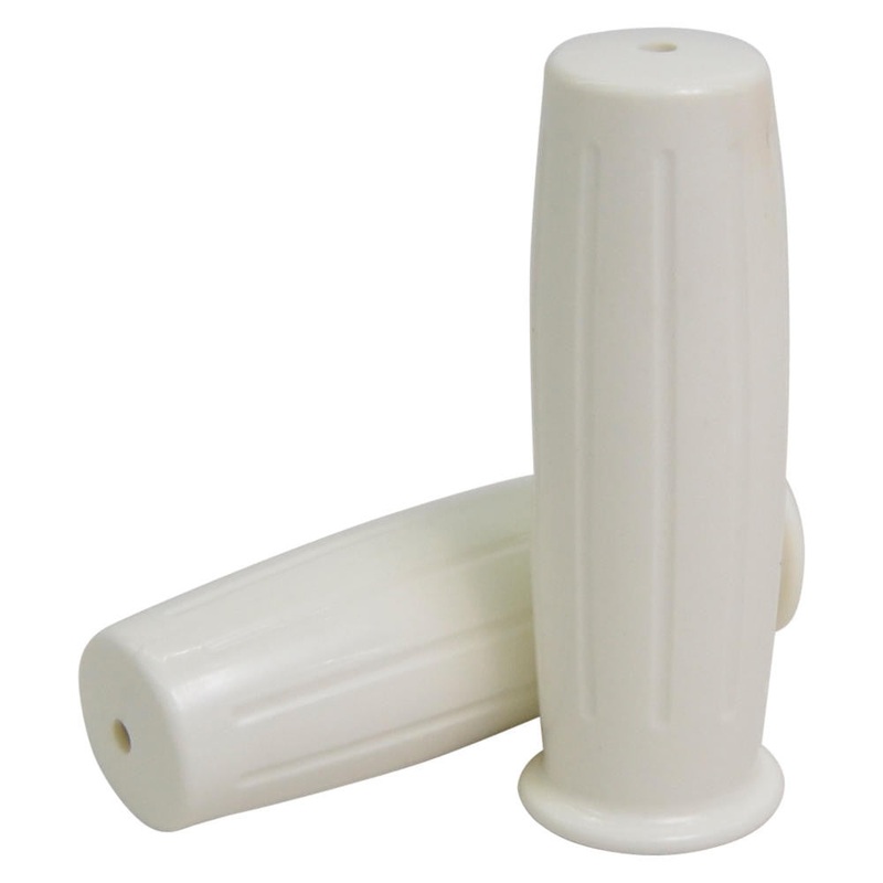 These grips are straight from JTC Engineering “Genuine Spares” Amal-style grips found on British bikes of the 1960s. These grips are white in color and fit a 7/8-inch bar.