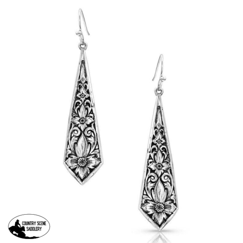 These stunningly beautiful western earrings are an upside kite shape dangling elegantly from a silver post. Hand painted black accents highlight the masterfully engraved silver fleurets and bright cut western design. Lightweight and comfortable, these earrings are sure to become a favorite. Earrings dangle on hypoallergenic French wires.