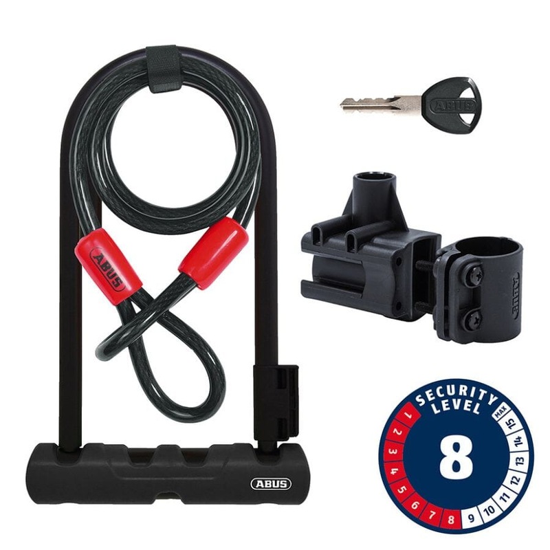 The Abus Ultra 410K + Cobra U-Lock combo delivers reliable bike security with the added versatility of a loop cable. The 12mm round shackle is crafted from temper-hardened steel and features a double-bolt locking mechanism that resists torsion and cutting