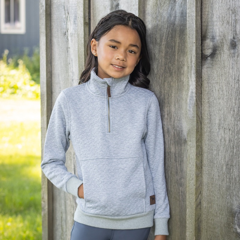 The Aerion Adelia Quilt Top is now available for kids! Exclusive to Greenhawk, this 1/4 zip top is soft, comfortable, and versatile. Great for pairing with breeches and features a quilted design with a front kangaroo pocket and faux leather zipper pull.