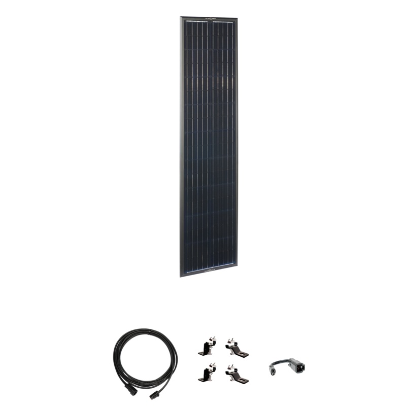 Perfect for Airstream trailers or any other curved mounting surface, our OBSIDIAN SERIES 90-Watt long panel works with any type of 12-Volt battery. As thin as a flexible panel and 30% lighter than a traditional panel without compromising efficiency, this A