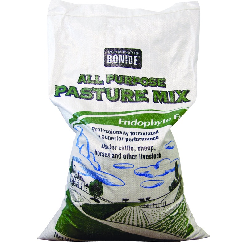 Our endophyte free mix of premium pasture seed varieties grows high quality forage, approved for all grazing animals. These hardy grasses tolerate low grazing. They are high in sugars for energy and palatability. And, our mix includes a significant white clover component, which animals love and which acts as a great nitrogen fixer for your pastures. A veritable smorgasbord in a bag!
