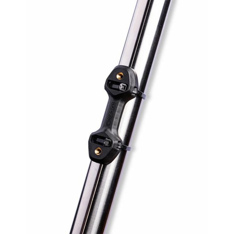 – No bottle bosses? No problem.– Clean the area, peel off backing, stick in place.– Bottle cage covers head of zip tie for a clean look.