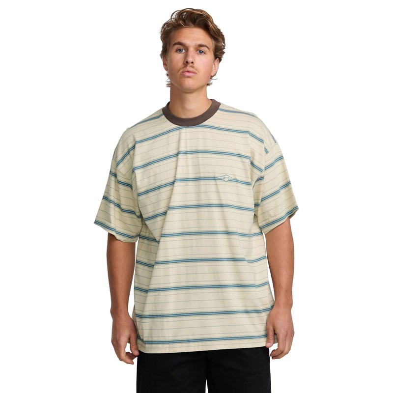 Fabric: Cotton yarn dye stripe jersey fabric [155 g/m2]Wash: Garment wash with softener for extra soft hand feelNeck: Crew neckSleeves: Short sleevesClosure: Pullover closureBranding: Diamond wave logo embroidery at chestArch logo label at hemOther Feature