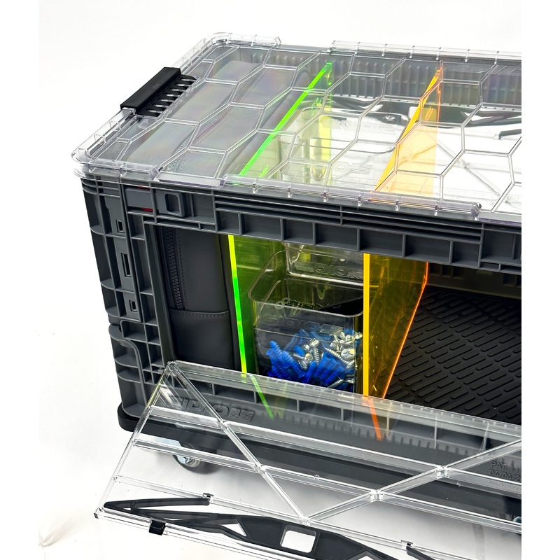 CollapsibleSide access windowStacks while collapsed with or without lidReinforced structure 200+lbs weight stacking/carrying capacity41 Divider SlotsStackable with Or without LidDurable polypropylene Block Copolymer Resists Cracks, Dents & Extreme Temperat
