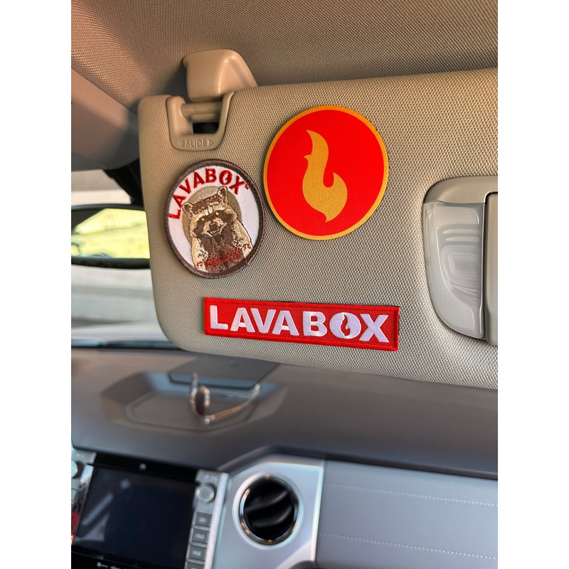 The round patches are about 3 inches. The Lavabox Logo patch is 5in x 1in. Dress up your headliner or Bugout Bag with these Velcro-backed patches!