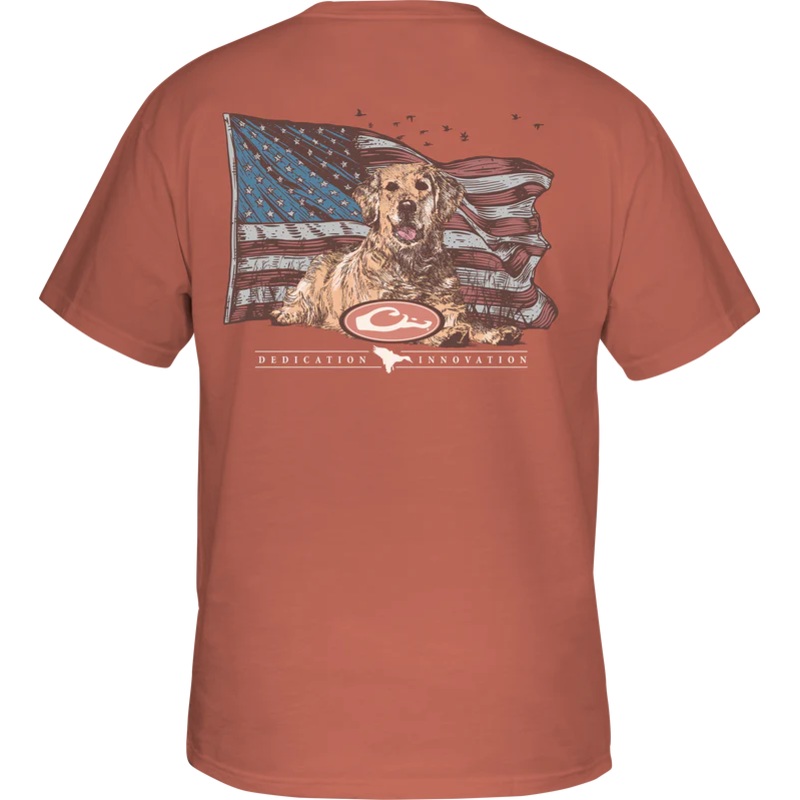 The Drake Waterfowl Graphic Tee is constructed with a 60% cotton and 40% polyester blend which supplies softness and comfort. The Drake Waterfowl Graphic Tee has a Drake logo on the front pocket and depicts aYellow Lab overlay over anAmerican Flag from our