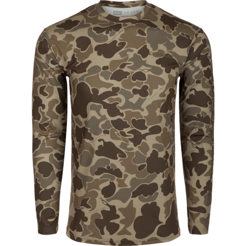 The Drake Long SleevePerformanceCrewdelivers exceptional functionality and is packed with performance features.Thefabric has Built-In Cooling, UPF 50, Moisture Wicking, Breathable StretchandQuick Drying. It is lightweight so it can be worn all year under many weatherconditions. The Drake PerformanceCrewcomesinHeathers and ourexclusive Old School Camo. Wear it on the water,in the field,orwherever youneeda performance garment.