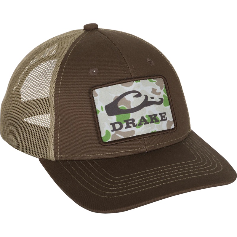 TheDrake Old School Patch Mesh Back Cap is a 100% cotton twillstructuredsix panel combinedwith a white polyester meshsnapback.It isconstructedina traditional trucker shapeanda slightly pre-curved visor.The patch is our exclusive Old School Camoofferedin tonal variations.From our Old School Series.