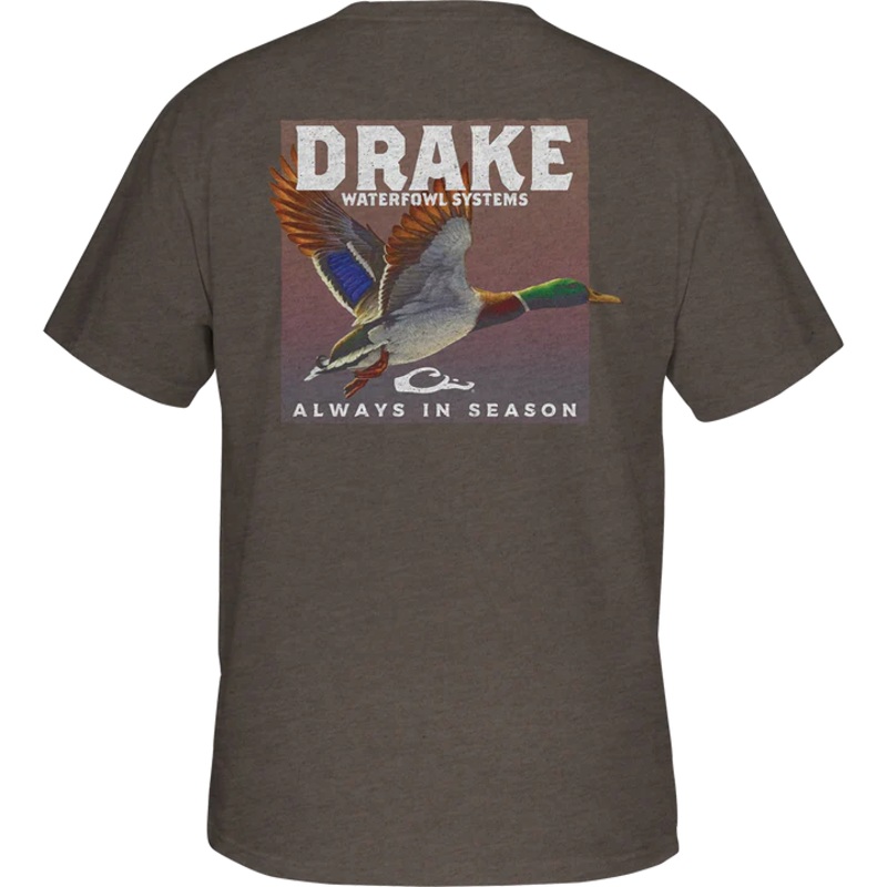 The Drake Waterfowl Graphic Tee is constructed with afabric blend whichsuppliessoftness and comfort.The Drake Waterfowl Graphic Tee has a Drake logo on the front pocket and depicts a Mallard graphic from our Vintage Drake Series of back graphic tees.