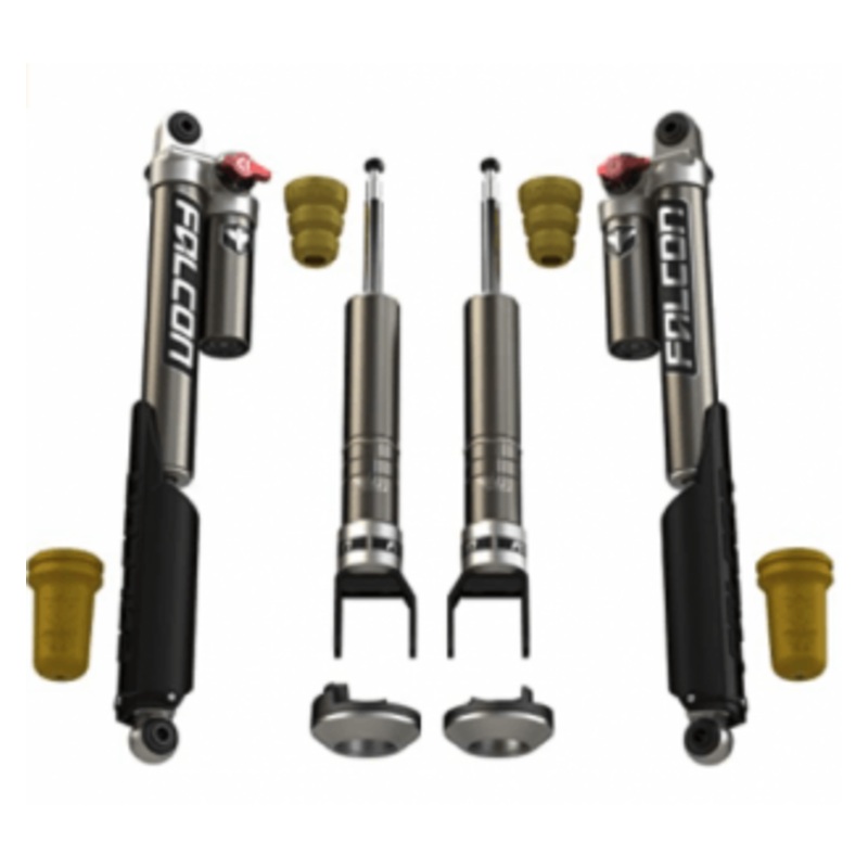 The 2010 and up Toyota 4Runner: Falcon Sport Tow/Haul 2 inch Lift Shock Absorber System pairs monotube front shock absorbers with adjustable piggyback rear shock absorbers. The rear shocks feature a three-position Fast Adjust Knob that allows the driver to