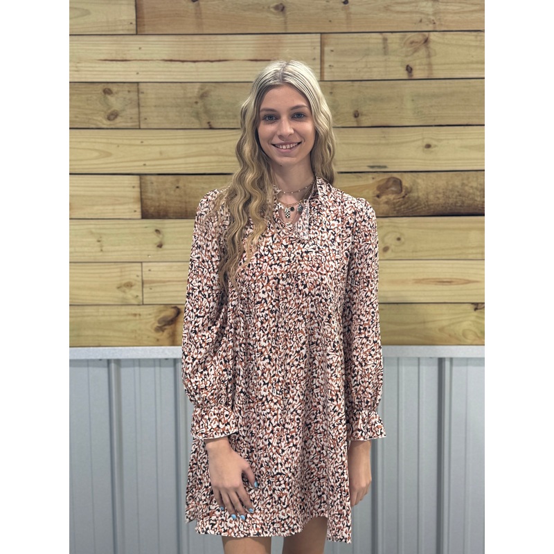W29224614332Floral V-Neck Dress – Elegant Long Sleeve Loose Fit Mini Dresses