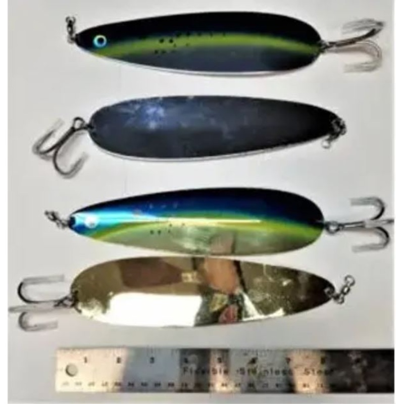Flutter spoons are available in 8″ and 9″, either Menhaden/chrome, Menhaden /chrome, Herring/chrome, or blue crystal/chrome. Spoons, ball bearing swivels (140 lb. test), and split rings (140 lb. test) are stainless steel. Ultra-Antirust 4/0 BKK 6066 – 4X – NP- UA hook. Packaged in a heavy-duty poly bag with a hole header. Approximate weights are 8″ – 4 oz. and 9″ – 5 oz.