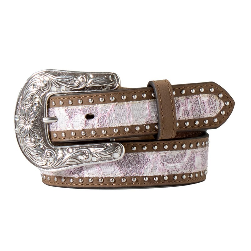 • Brown Leather Western Belt with Pink and Glitter Lace Inlay.