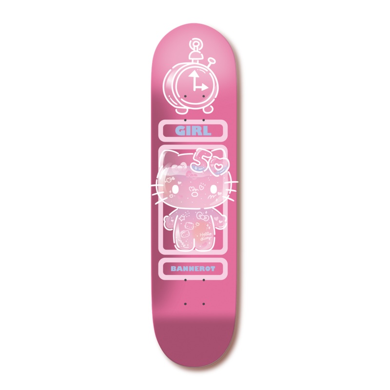 Girl x Hello Kitty 50th Bannerot 8.5" Skateboard DeckCelebrating the 50th Anniversary of Hello Kitty, Girl welcomes the signature Simon Bannerot 8.5" skateboard deck showcasing co-branded accents throughout. The shiny imagery on the bottom ply has Hello Ki