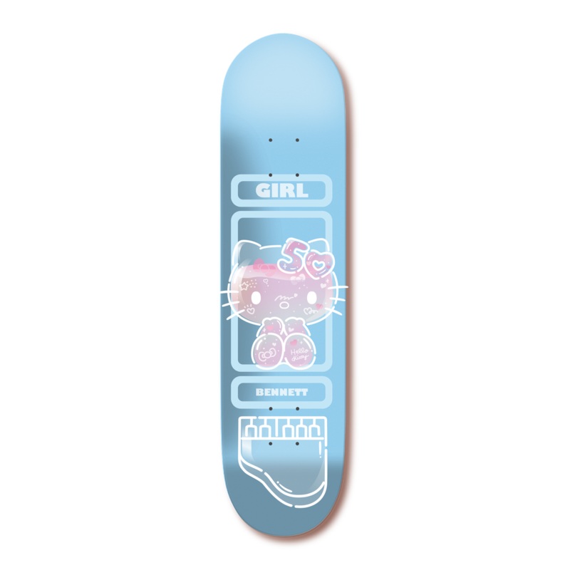 Girl x Hello Kitty 50th Bennett 8" Twin Tail Skateboard DeckCelebrating the 50th Anniversary of Hello Kitty, Girl honors pro rider Niels Bennett and the 50th Anniversary of Sanrio's famous Hello Kitty with the 8.0" skateboard deck. Pink, white, and blue ar