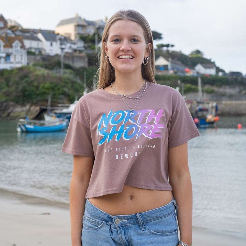 Step into a blend of elegance and retro charm with the Northshore Girls 80's Fade Crop T-Shirt in Dusky Rose, adorned with a mesmerising blue to pink fade print. This unique piece draws inspiration from the vibrant energy of the 80s, while its dusky rose b