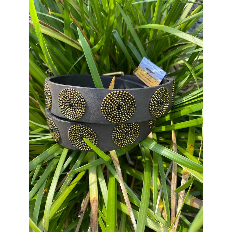 The Kenyan Collection - Gold Disc Belt - Wide WidthIntroducing The Gold Disc Belt - Wide with awidth of 1 1/2 inches: Featuring gold beaded discs on rich brown leather, this accessory is perfect for adding a touch of sophistication to any outfit. Whether p