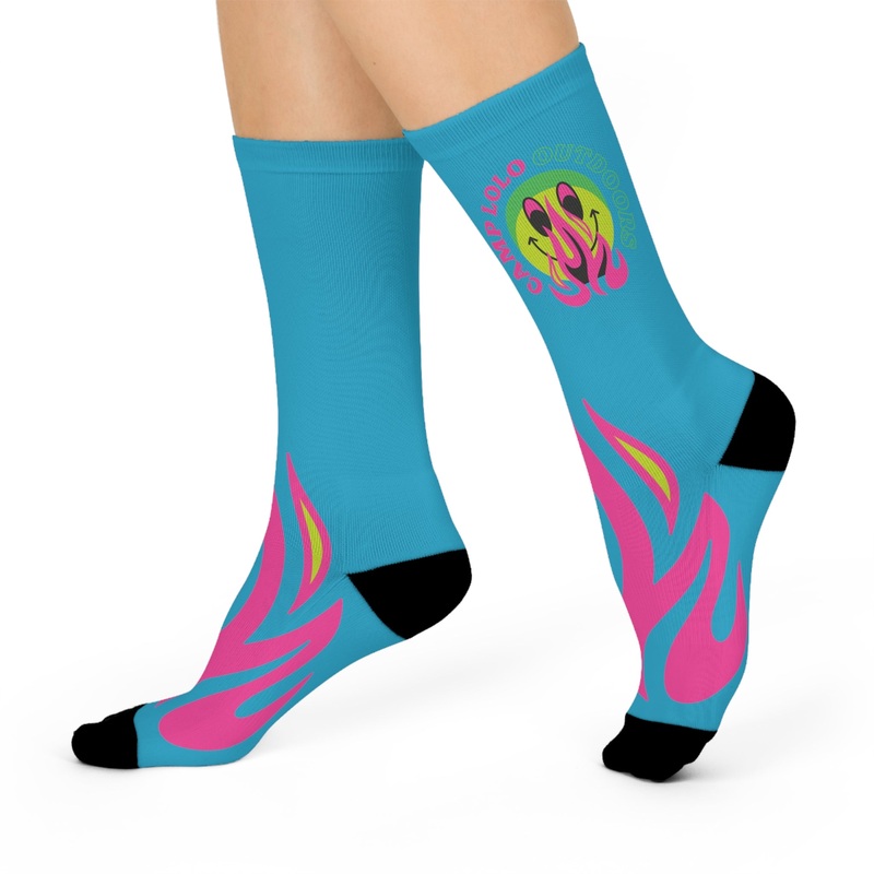 Who doesnt love rad socks? These even look good with sandals....: Material: 73% polyester, 18% nylon, 3% cotton, 6% spandex.: One size: comfortably fits women's size 5 US up to men's size 12 US.: 200 needle knit premium socks.: Cushioned bottomsWhiteLength