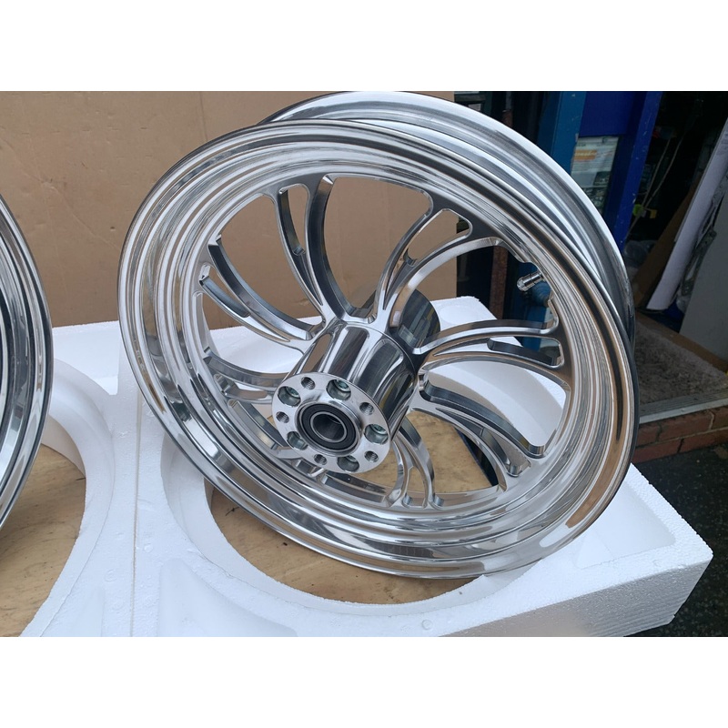awesome wheels that wont only make your ride feel smoother but will also stand out and grab the attention of anyone!Absolutely beautiful 3D Custom Chrome Harley Davidson vortex wheels for sale, perfectly designed for softail or bagger. ideal for big wheel conversion. this wheel delivers unparalleled style and performance. Upgrade your Harley Davidson with this exceptional custom wheel and experience the ultimate in aesthetic appeal and driving excellence!