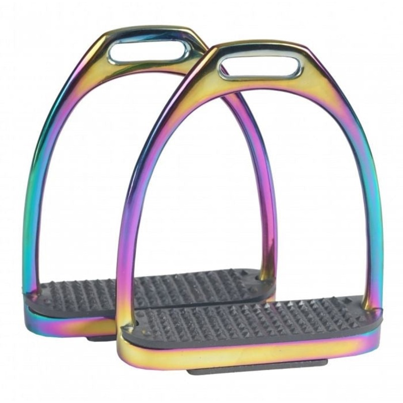 Trendy stainless steel stirrups with rainbow look.