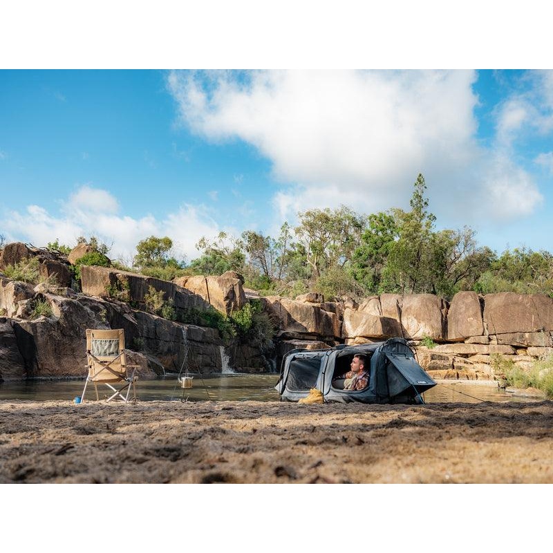 The Sundowner 1P Swag's freestanding design makes it a true overlander swag that's fast and easy to pitch. The near vertical walls and sturdy wide body provide generous internal space, and the 2.75in high density foam mattress with removable, washable luxe