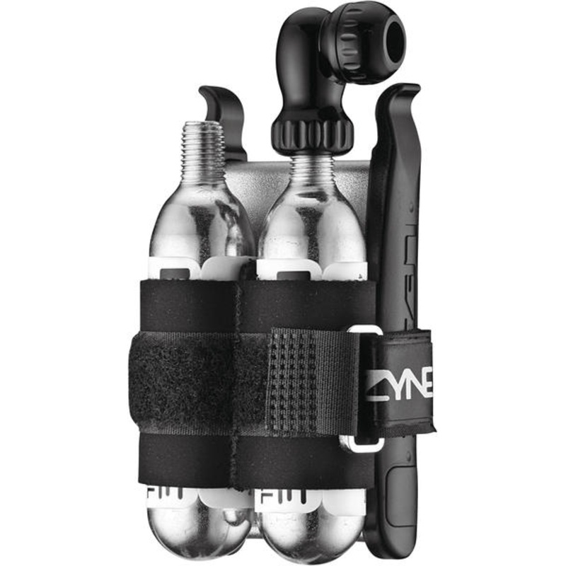 Lezyne's convenient Twin Kit includes their Twin Speed Drive CO2 inflator, two CO2 cartridges, a couple tire levers and a Velcro strap to keep it all together. Its aluminum head is compatible with both Presta and Schrader valves, and uses a simple twisting
