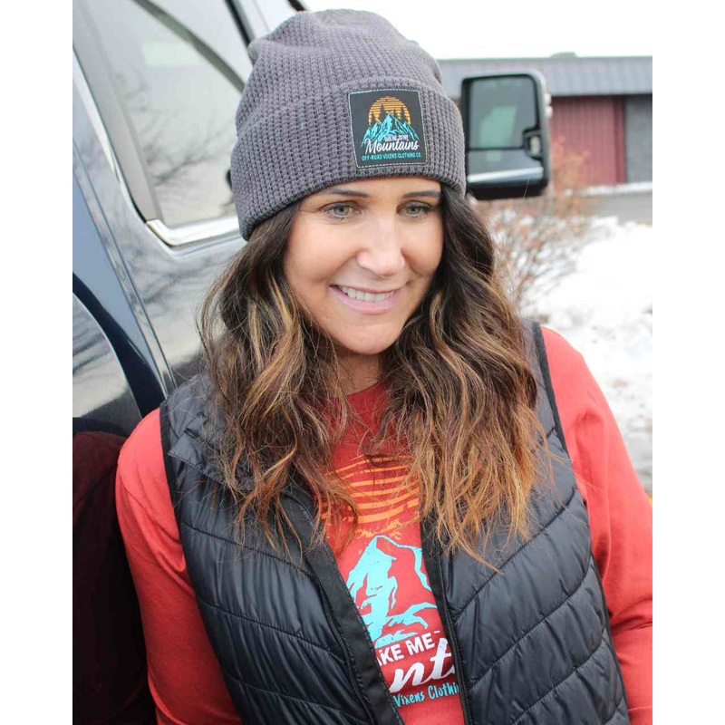 Our popular Mountain Time design on our custom dark gray waffle knit beanie. Perfect beanie for after those long snowmobile, dirt scoot, or SxS rides.