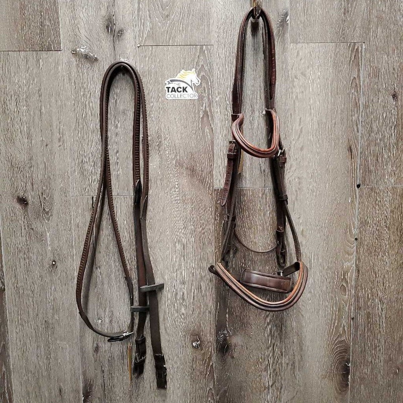 QOVE262820482Narrow Rsd Monocrown Bridle, Soft Rubber Reins *gc, clean & mnr dirt, film, dry & scraped edges, loose hook, mismatched reins F *H Brown Used