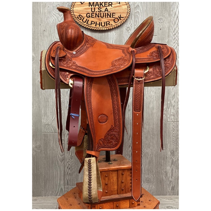 You haven’t sat in a Billy Cook until you’ve sat in a Billy Cook ranch saddle! And the Nebraska Ranch series takes these hard-working saddles to a new level. Under the hood you’ll find all the genuine Billy Cook features you’d expect – Rawhide covered quarter horse bars, top grain leather, strong flat plate rigging, and, of course, the signature Billy Cook stamp on the fenders, cantle, and skirt. But this saddle doesn’t stop there. Billy has dressed this work horse up with a wide basket and floral border – so thick it looks more like a fully tooled saddle than a border! The round skirt and rawhide pencil roll cantle set this beauty apart from the other Nebraska Ranchers. Billy’s signature 5.5″ cantle on a hard seat will keep you secure and comfortable during long days in the saddle. A strong 2.5″ rawhide bound horn sets on top of the generous 14″ swell. Finished with brass hardware, roper stirrups, and a rope strand cinch. Don’t settle for any other ranch saddle. When you buy a genuine Billy Cook, you’re buying a saddle that will become a family heirloom – passed down for generations.