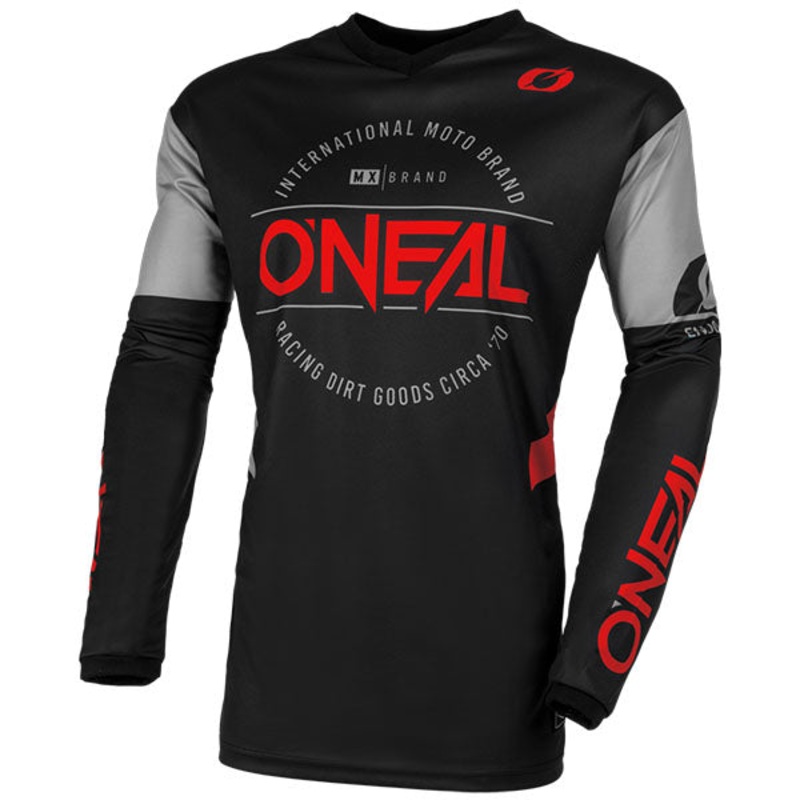 O'Neal - Element Brand V.23 JerseyFIT: Relaxed fit for increased comfort and flexibility. Raglan Cut. For tighter fit, order one size downFeatures:Jersey weight 9.3oz (size L)Extended tailSublimated graphics that wont fadeV-Neck collarTagless neck designFu