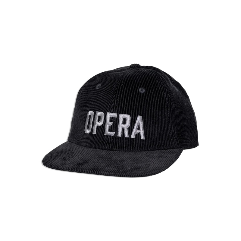 Opera Corduroy HatSix panel ultra low unstructured corduroy hatEmbroidered opera logoSelf fabric back strap with adjustable buckle closure
