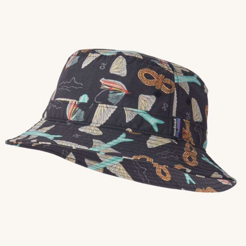 Designed for adults, this bucket hat is made with a durable water-repellent finish and can be rolled up and stored in its own internal pocket, making it convenient to carry around. The black base with a funky abstract print featuring flying fish and fishing flies, along with the Patagonia tab on the side, add a pop of style to this functional hat. Keep the sun off your face with its wide-brim design, while staying comfortable and cool.