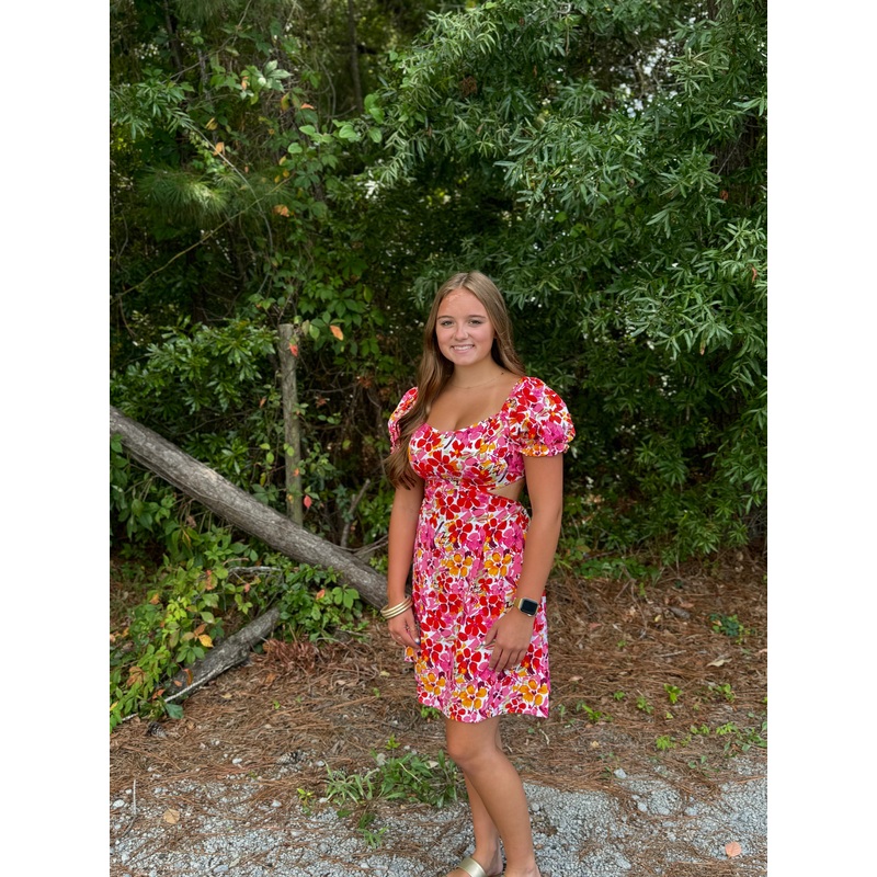 W29224614555Pink Floral Print Crew Neck Short Dress